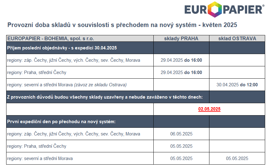Dne 2. 5. 2025 budou sklady z provozních důvodů zcela uzavřeny.