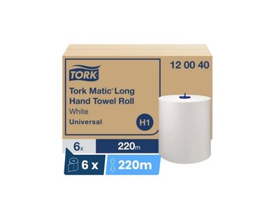 Tork Matic® Universal papírové ručníky v roli H1 nabízejí vynikající poměr ceny a kvality, ideální pro náročné prostředí, jako jsou školní umývárny nebo letištní toalety. S vysokou kapacitou až 880 ručníků v jedné roli poskytují efektivní řešení pro mechanické zásobníky Tork Matic.