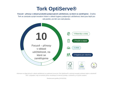 Vysokokapacitní systém bezdutinkového toaletního papíru Tork OptiServe® je určen pro zařízení, kde je klíčová efektivita a udržitelnost a je třeba udělat co nejlepší dojem na uživatele. Představuje lepší alternativu k běžnému toaletnímu papíru a tradičním jumbo rolím. Díky široké nabídce zásobníků lze různé potřeby v rámci zařízení uspokojit pouze s jedním typem toaletního papíru.