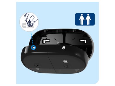 V rušných toaletách hrozí častý nedostatek papíru a zbytečné plýtvání. Náš Tork SmartOne® Mini Twin Dispenser pojme dva role, které lze spotřebovat až do konce, čímž se minimalizuje plýtvání a doba údržby. Distribuce jednoho listu na jedno použití snižuje náklady a spotřebu až o 40 % a zajišťuje více použití na roli ve srovnání s tradičními dávkovači jumbo toaletního papíru. Navíc hosté se dotýkají pouze toho, co si vezmou, což zlepšuje hygienu. Tento dávkovač má moderní design a praktický zámek, který chrání role v náročných prostorách. Klimaticky neutrální – vyrobeno s použitím certifikované obnovitelné elektřiny a kompenzováno klimatickými projekty.