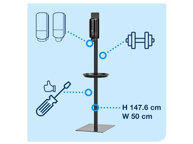 Zlepšete hygienu rukou ve vaší firmě s tímto hygienickým stojanem pro dávkovače dezinfekce rukou Tork. Umístěte stojan tam, kde je to nejvíce potřeba, aby byla hygiena rukou dostupná pro každého v oblastech s vysokým provozem nebo v odlehlých místech, i pokud není k dispozici ...