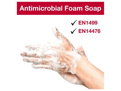 Důkladně si umyjte ruce s naším Tork Antimicrobial Foam Soap. Tento produkt kombinuje mytí rukou a dezinfekci do jednoho postupu a má nízkoalkoholovou formuli, která je vysoce účinná proti bakteriím, obaleným virům a kvasinkám. Je také bez parfemace a barviv, čímž snižuje riziko alergických reakcí. Používejte s dávkovači Tork Foam Soap, které jsou snadno použitelné a snadno se udržují – doplňování trvá méně než 10 sekund. Používejte biocidní produkty bezpečně. Před použitím vždy přečtěte štítek a informace o produktu.