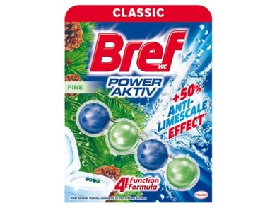 Bref Power Aktiv je složen ze 4 kuliček uložených v průhledném nerozebíratelném košíku, které zvládnou více funkcí při každém spláchnutí - hygienickou čistotu, příjemnou vůni, odstranění usazenin a vytvoření bohaté pěny pro lesk a bělost toalety.