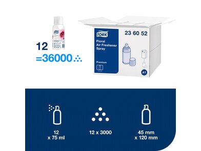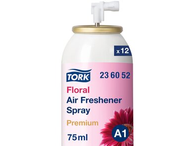 Udržujte každé toalety příjemně vonící a čisté s Tork Floral Air Freshener Spray. Efektivně odstraňuje zápachy pomocí speciálních neutralizačních látek a obsahuje koncentrované vonné oleje pro dlouhotrvající svěží vůni. S vůní vyvinutou předním evropským parfumérem zanechá tento osvěžovač vzduchu skvělý dojem na každého hosta. Pro maximální efektivitu v toaletách kombinujte tento sprej s velmi praktickým dávkovačem Tork Air Freshener Spray Dispenser.
