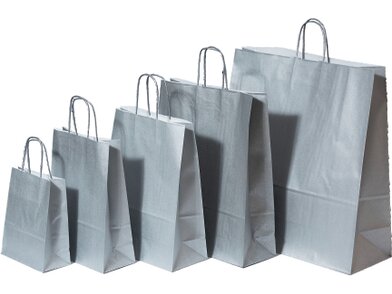 Stříbrná dárková papírová taška s krouceným uchem. Hodí se také do každého obchodu s kosmetikou, módou a dárky.