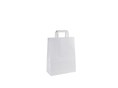 Papírové tašky s plochým uchem v mnoha provedeních standardních rozměrů, včetně možnosti potisku od jedné barvy až plnobarevně na přání zákazníka. Papírové tašky jsou vyrobené z bílého kraftového papíru. Mají vysokou pevnost a zároveň jsou šetrné k životnímu prostředí.